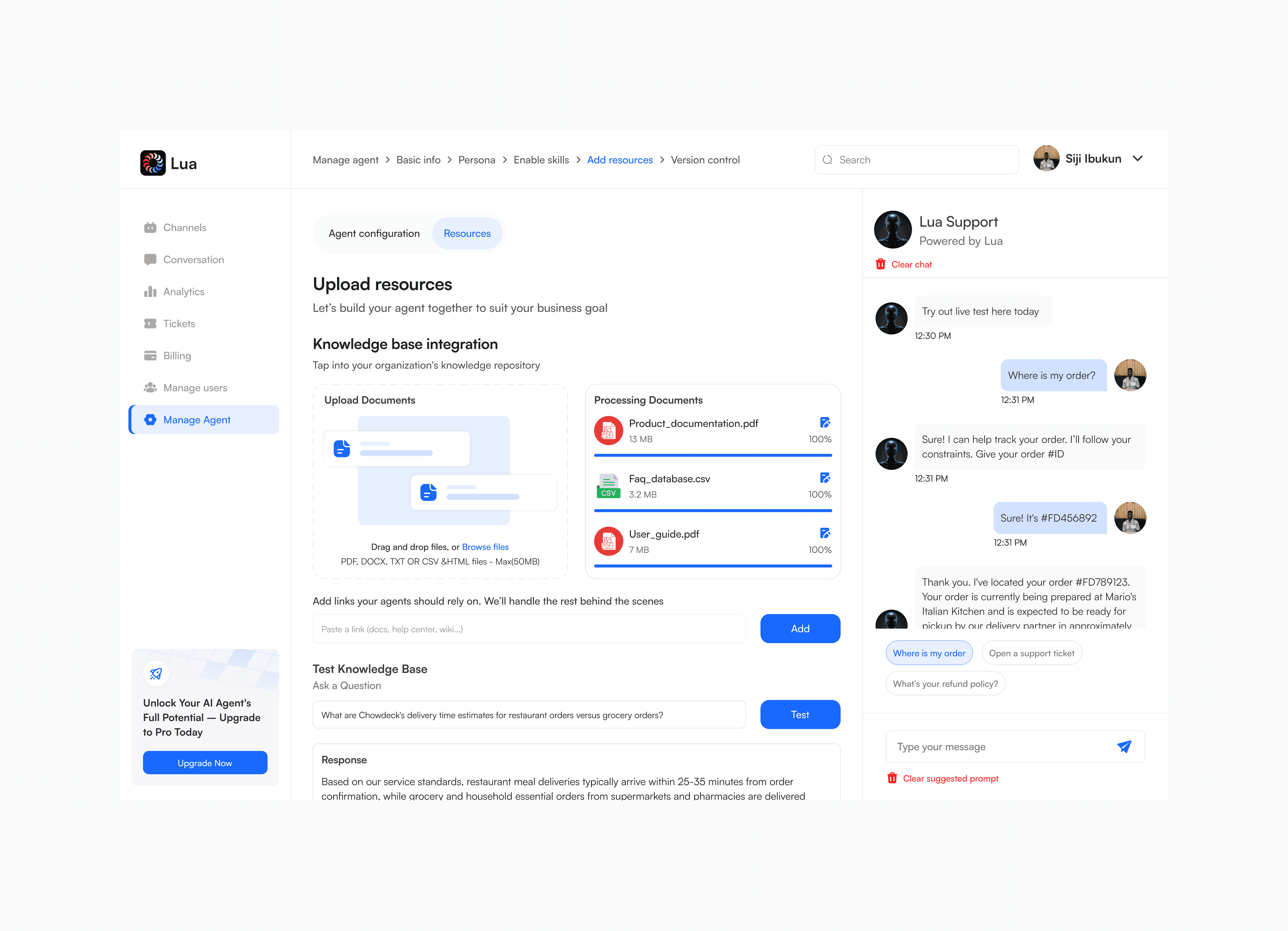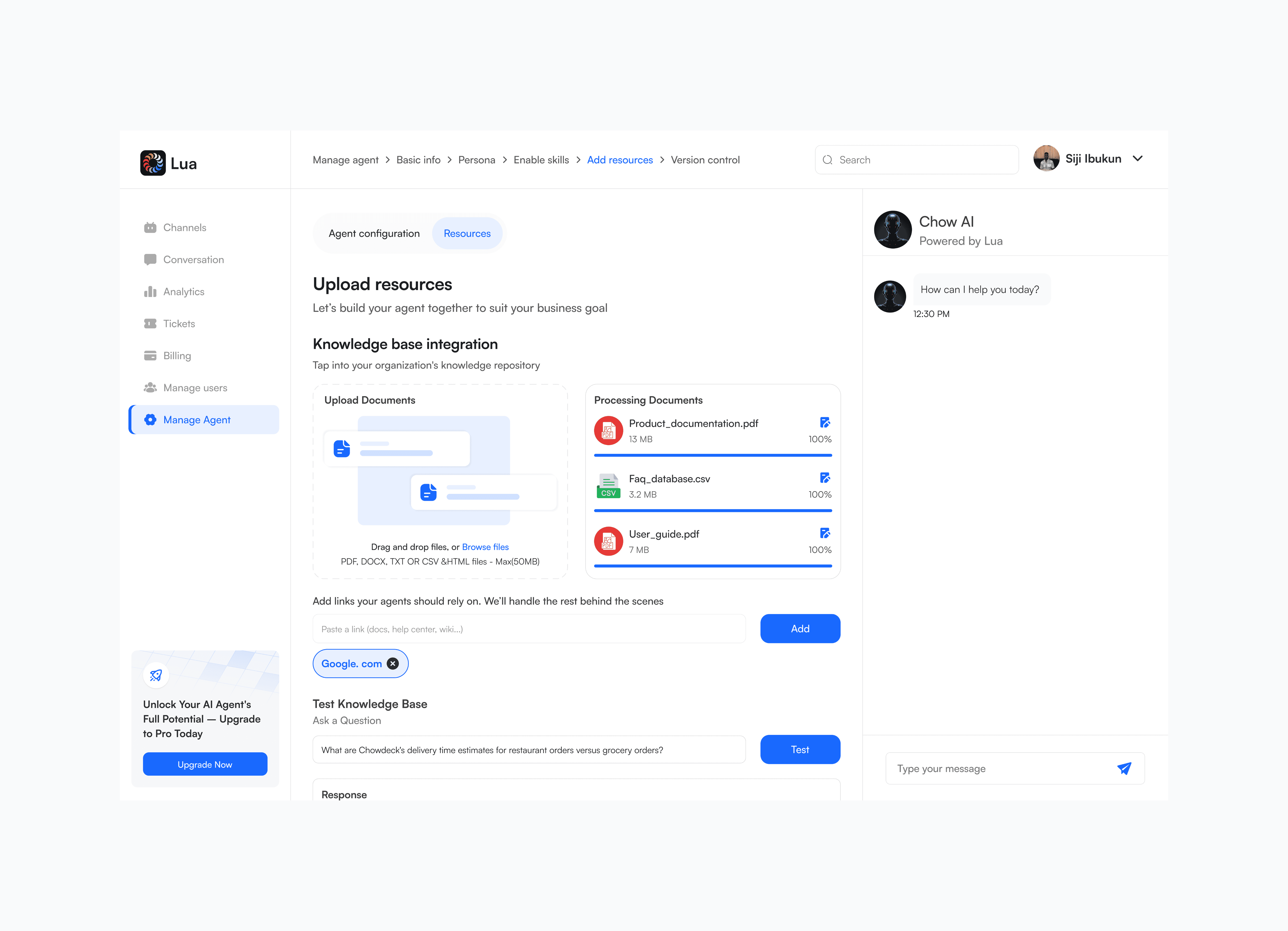 The core function of the Resources tab is to provide the agent with the necessary information to act like the business's best staff member. Lua agents are trained on your sales materials and processes. The redesign ensures that non-technical users can easily supply this critical information without third party assistant.