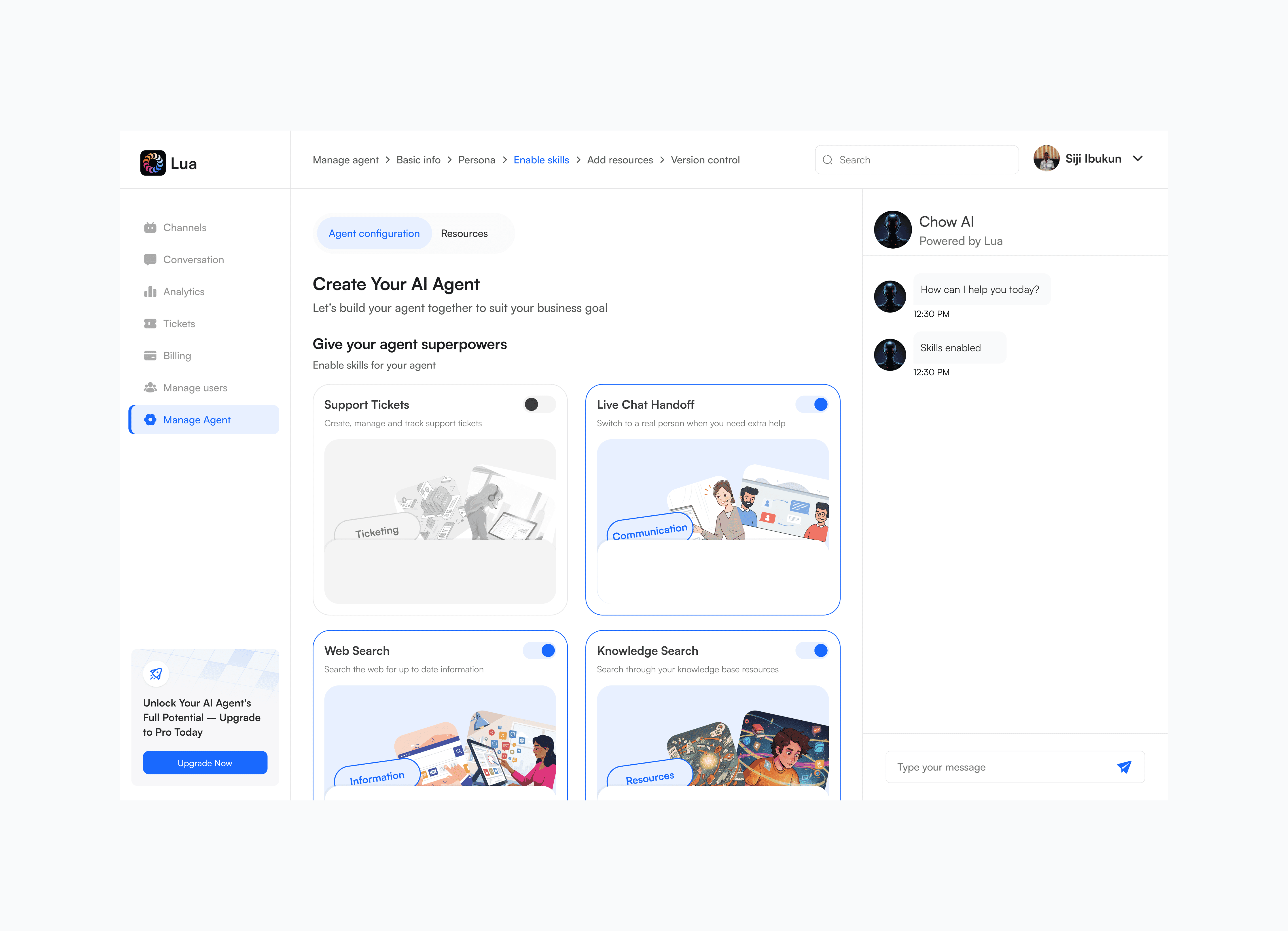 The skills include support tickets, live chat handoff, web search and knowledge search. They are key functionalities that must be easy to enable. The redesign ensures these "superpowers" are easy to access and understand.