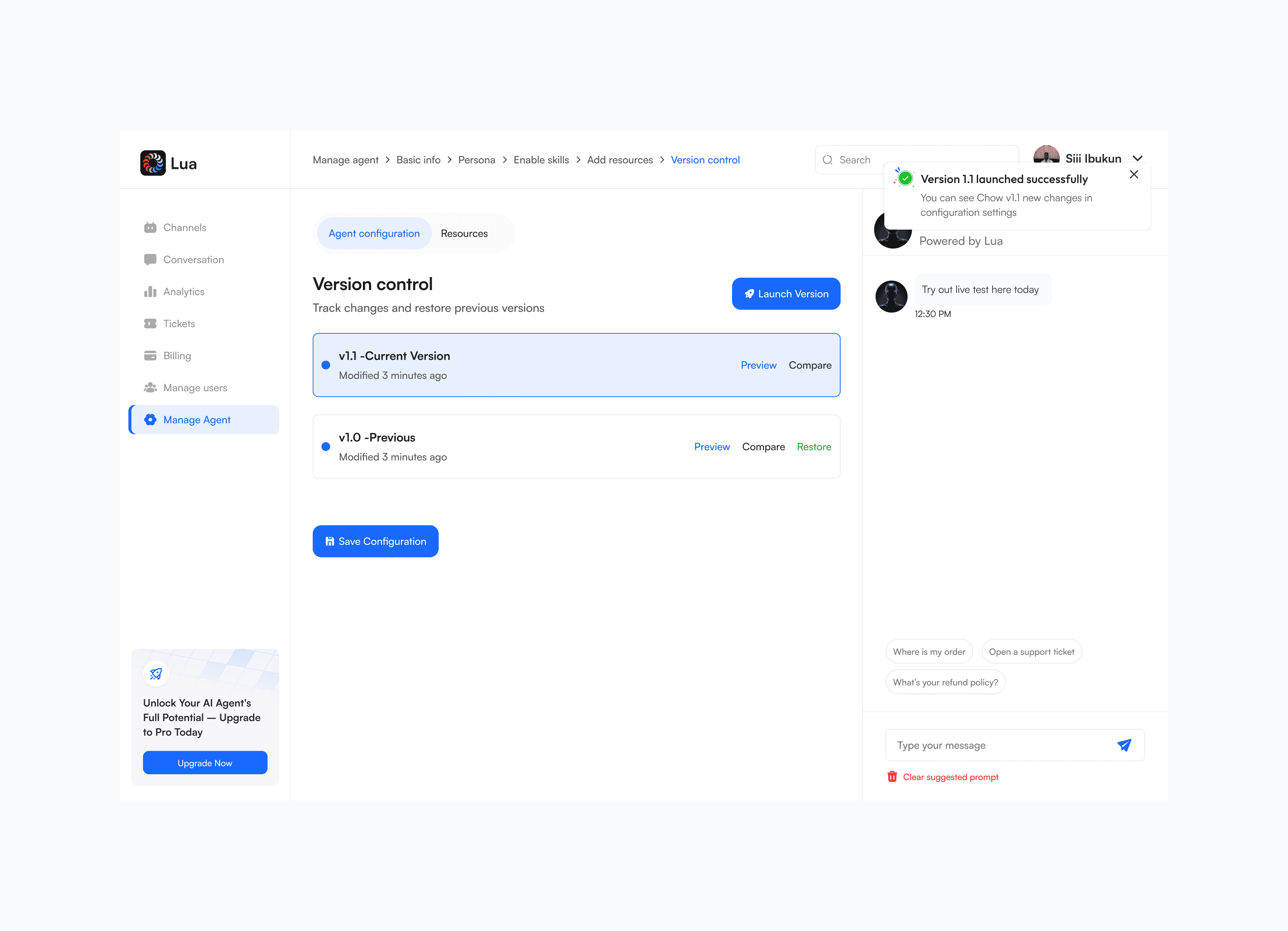 The Launch action marks the final, successful step in the configuration process. Launching creates a new version in the history timeline, clearly communicating that the agent is now live and ready to convert conversations into sales 24/7.