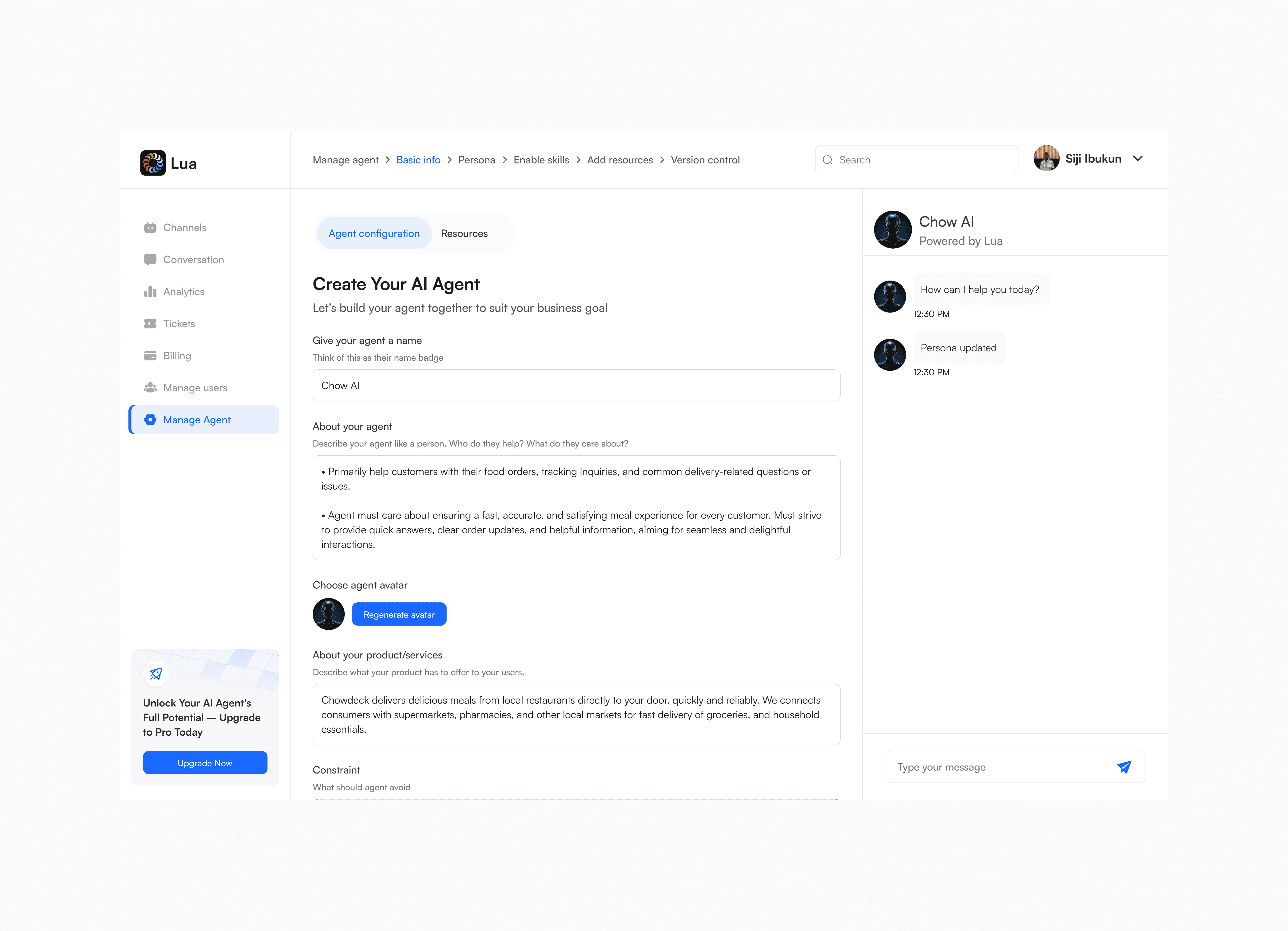 Basic info (Agent name, avatar, about product & constraint) prototype